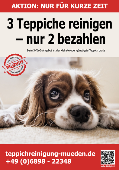 Unser 3-für2- Angebot für Ihre Teppiche. Exklusives Angebot für unsere Kunden im Saarland und Luxemburg. Lassen Sie 3 Teppiche professionell reinigen und zahlen Sie nur für 2 – der kleinste oder günstigste Teppich ist gratis!
